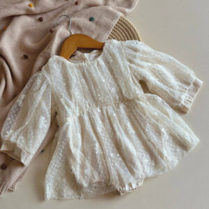 ₹1,850.00Made from soft net fabric, it features intricate bow embroidery that adds a graceful touch. The puff sleeves enhance its dreamy look, making it perfect for special occasions or stylish everyday wear. Lightweight and comfortable, this romper is a must-have for your little one’s wardrobe.
