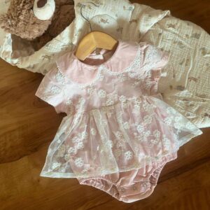 ₹1,850.00The Jinnie Romper is a sweet vision in blush pink, crafted with a soft cotton base and topped with delicate floral lace. Featuring a charming Peter Pan collar and dainty puff sleeves, this romper blends vintage charm with baby-soft comfort. The gathered waist and tulle overlay give it a dress-like feel, perfect for special occasions or capturing those picture-perfect moments.
