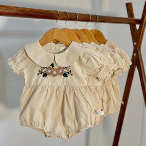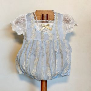 Cute and sweet blue party wear romper with pretty lace! Lace puff sleeves with floral embroidery add extra beauty to it.