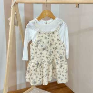 ₹1,850.00A charming two-piece set featuring a soft, long-sleeved white top with a delicate lace-trimmed ruffle collar, perfectly paired with a cream floral pinafore dress. The dress showcases a subtle texture, front pocket detail, and a gentle ruffle hem, ideal for adding a touch of vintage-inspired elegance to your little one’s wardrobe.
