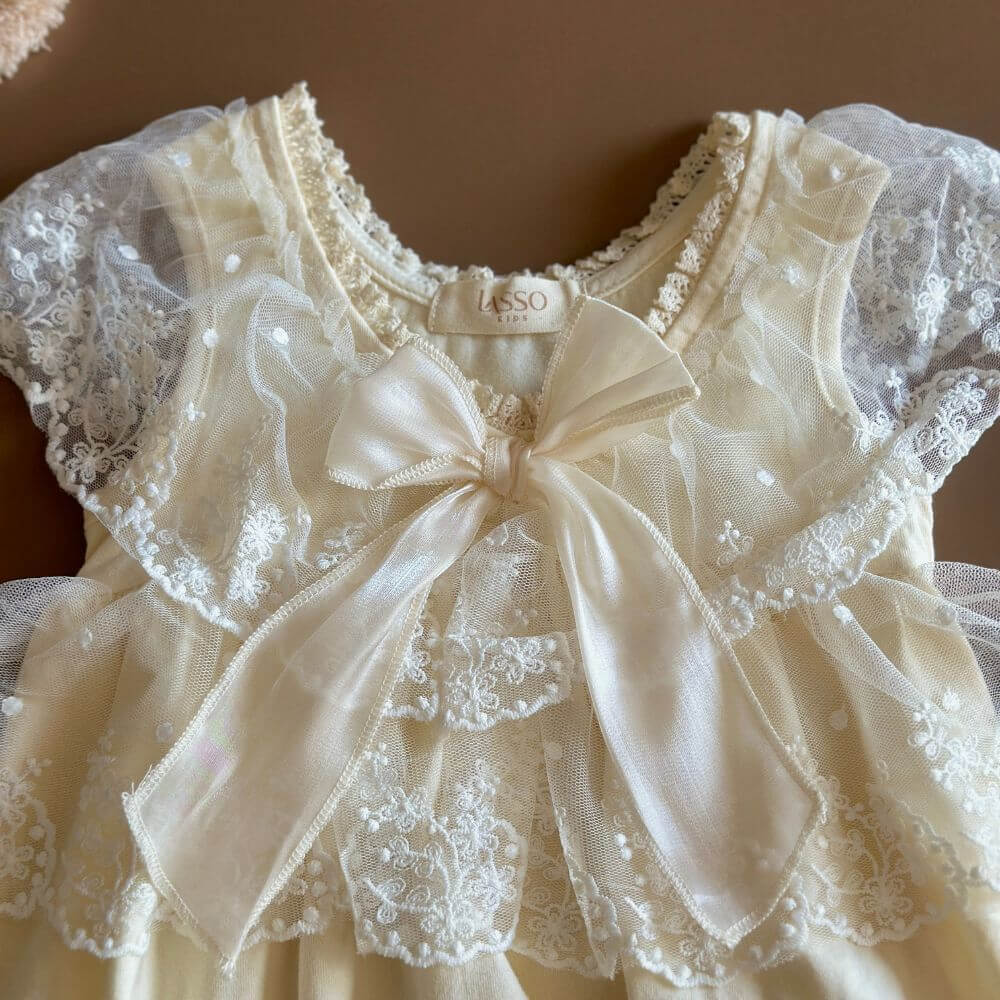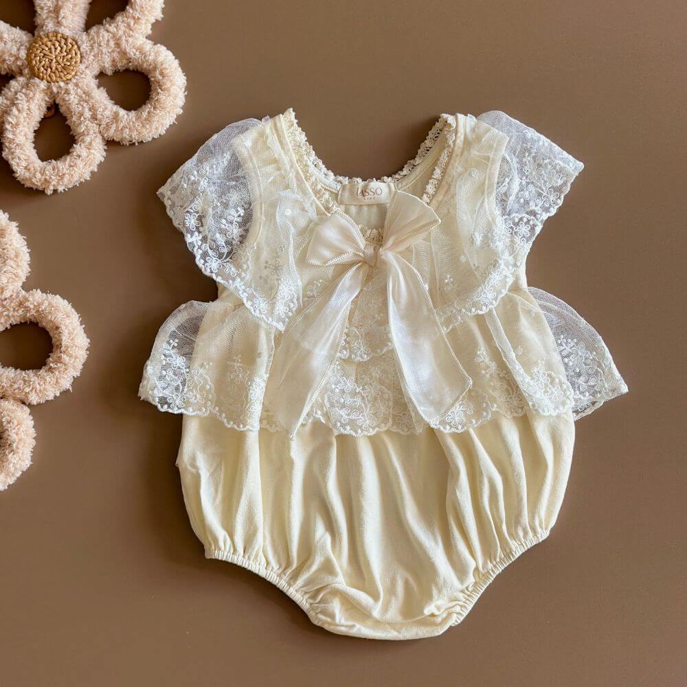 Delight your little one with our Apricot Romper. This cream-colored beauty features delicate lace detailing on the ruffled sleeves and a statement bow at the front, adding a touch of sweetness to every occasion. Designed with soft, breathable fabric, it ensures ultimate comfort for your baby’s tender skin. perfect for playdates, photoshoots, or special outings.
