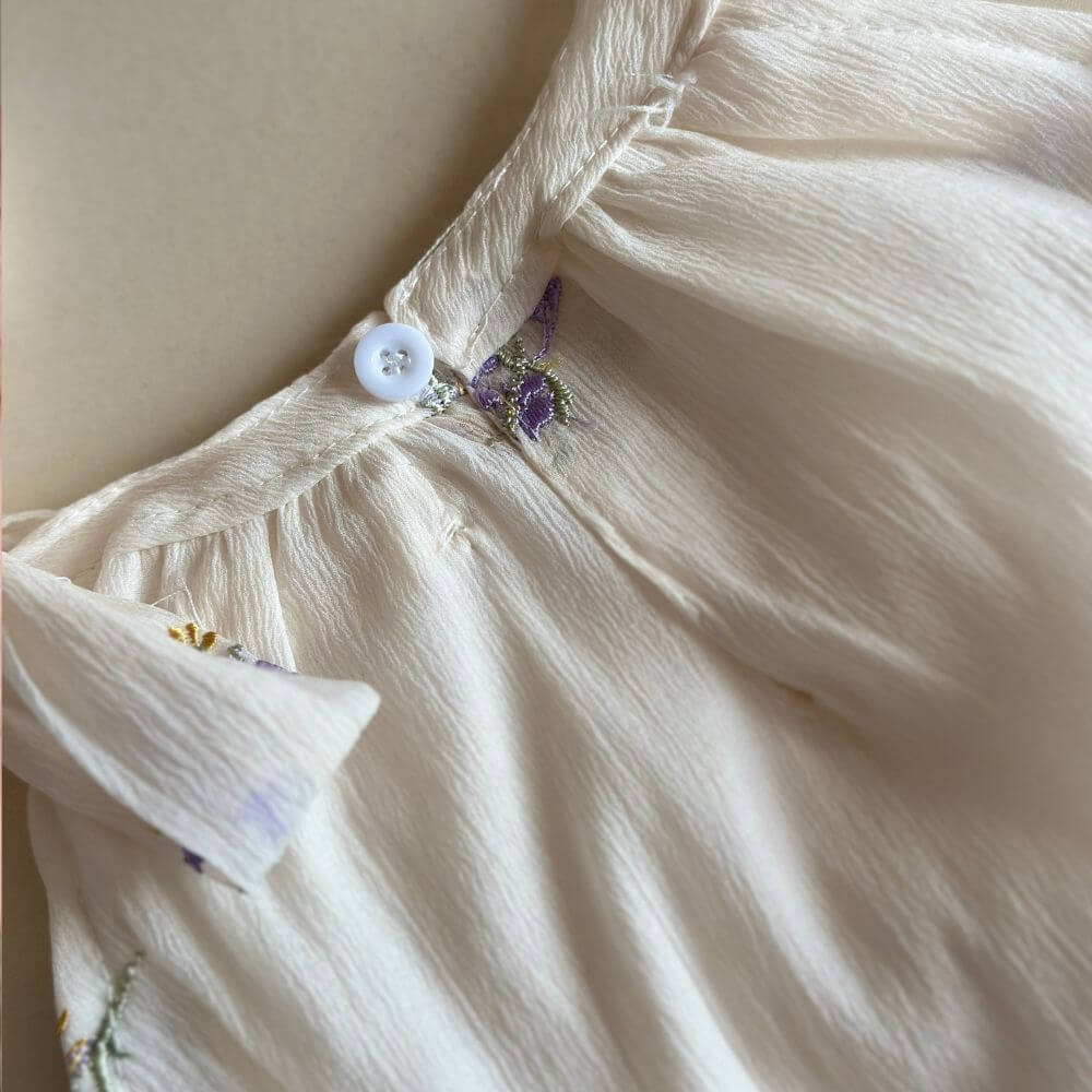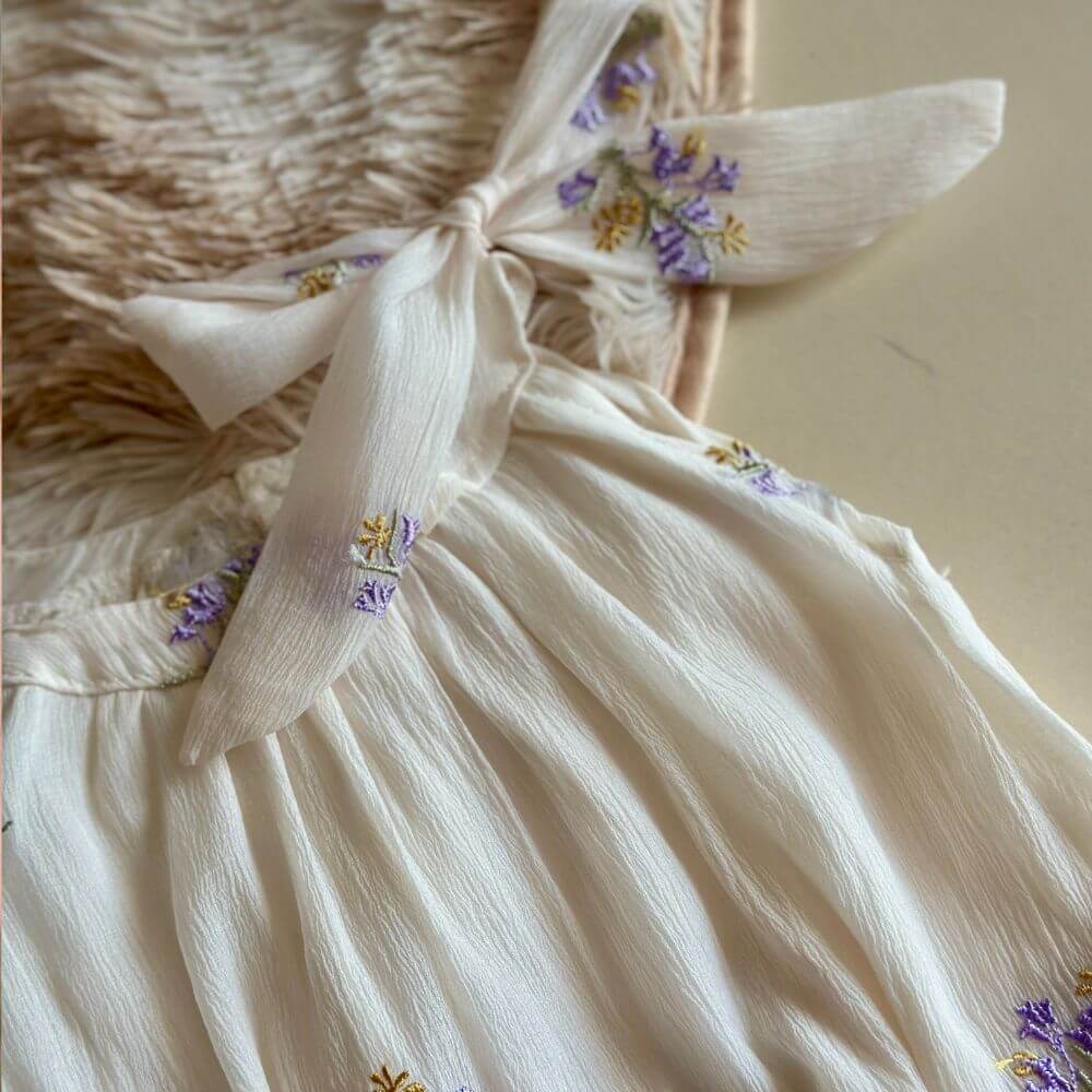 Our Lavie Romper features delicate lavender and yellow floral embroidery, soft pleated fabric, and a charming bow-tie shoulder. perfect for special occasions or everyday sweetness.