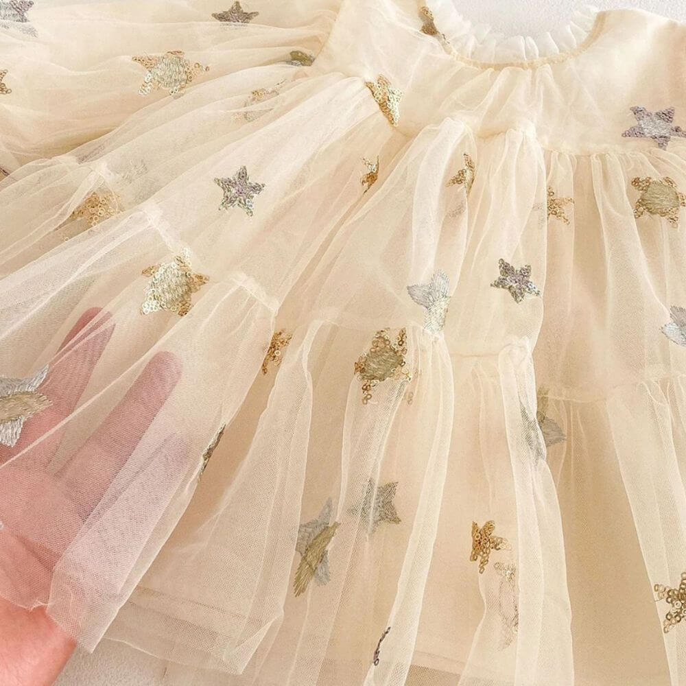 Crafted from soft tulle, this dreamy dress features puffy sleeves, a delicate ruffled neckline, and a sprinkle of silver and gold stars that shimmer like holiday lights. A perfect choice for every festive celebration.