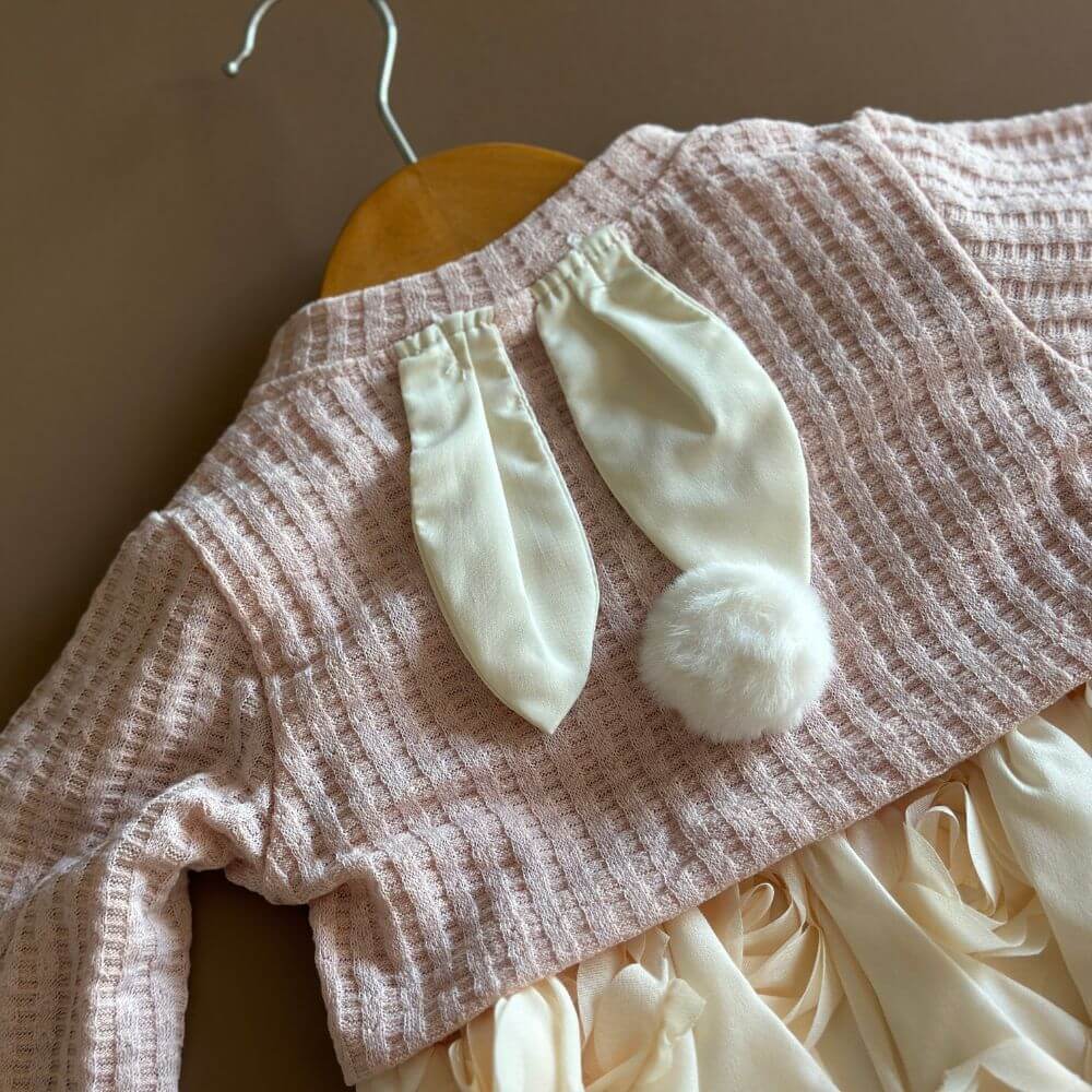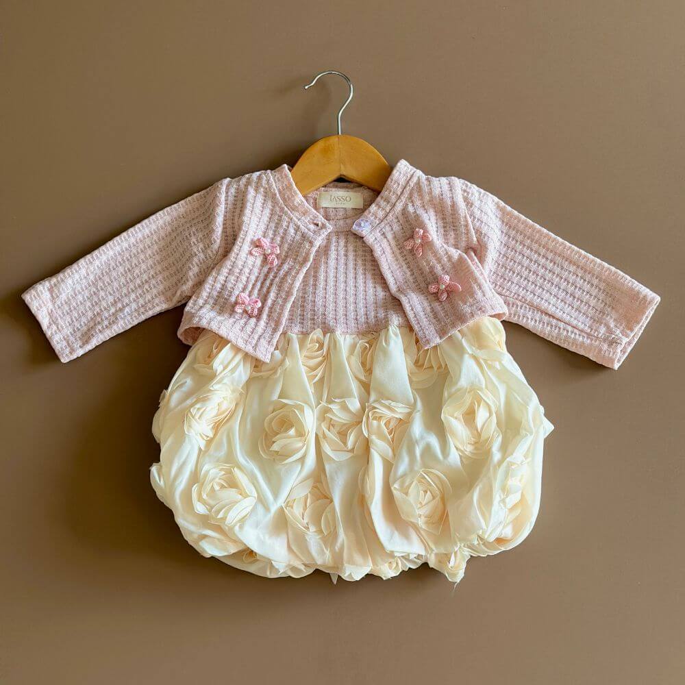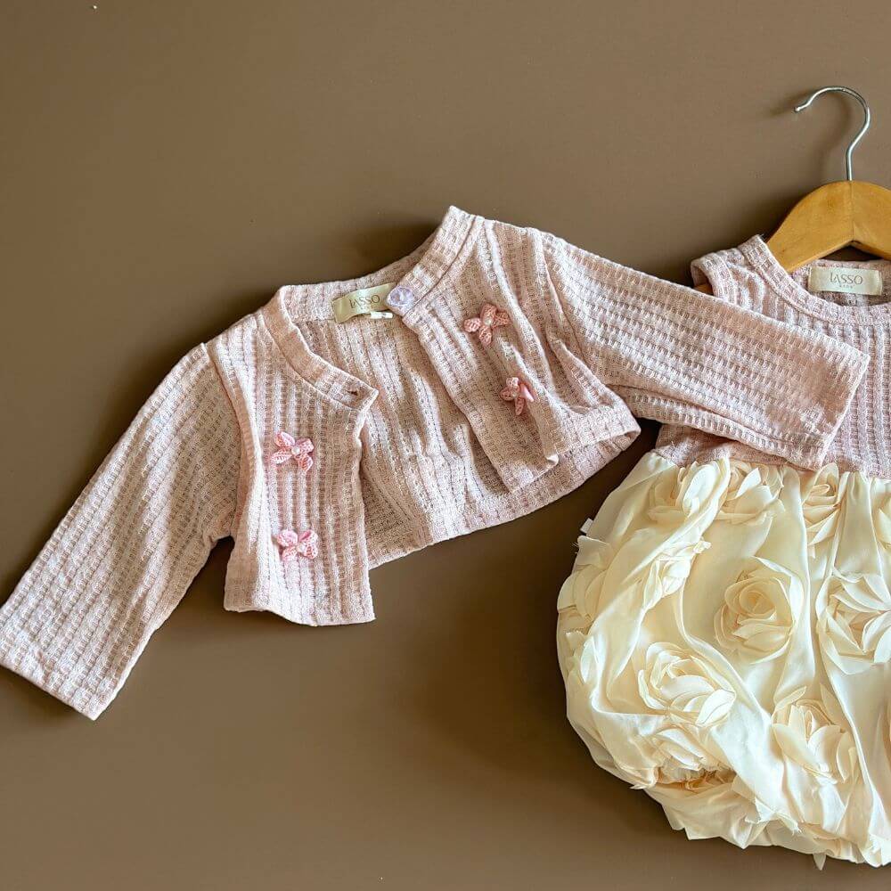 The set includes a soft pink knit cardigan adorned with delicate pink bows, paired with a cream-colored dress featuring lovely rosette details. Perfect for special occasions, photoshoots, or simply adding a touch of charm to your baby’s wardrobe.