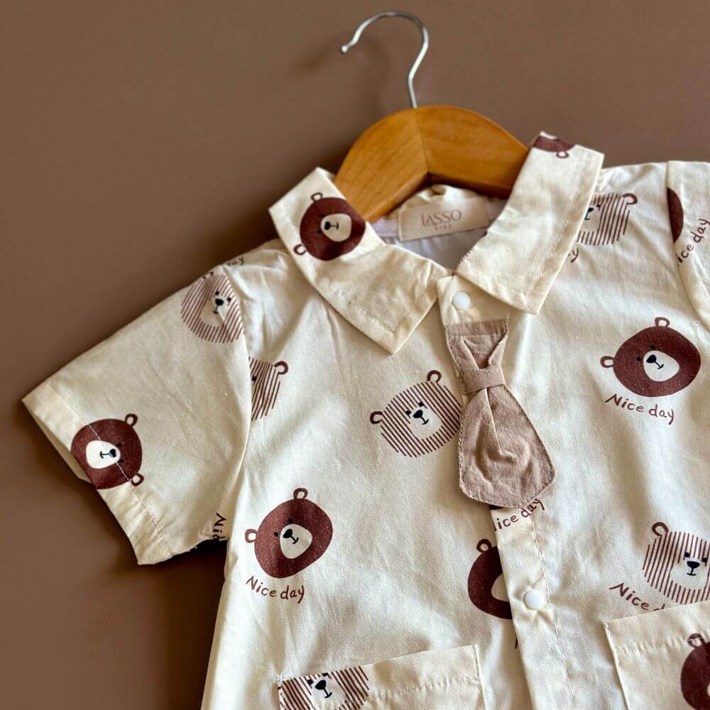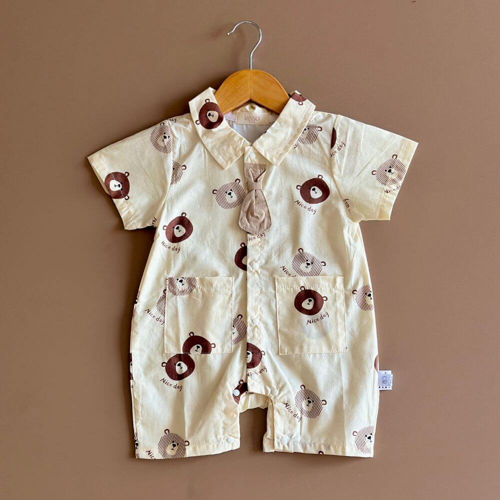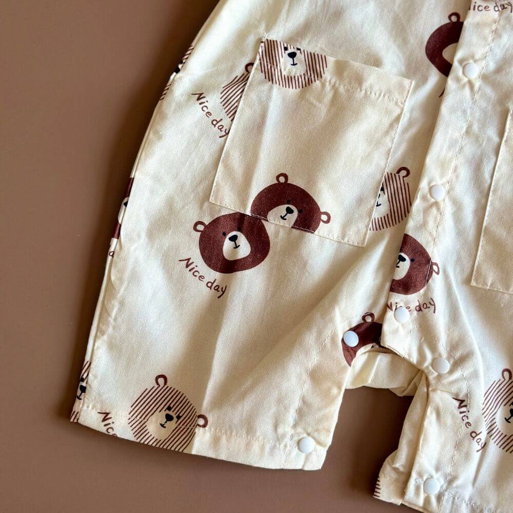 Crafted from soft, breathable fabric, this adorable romper features a playful teddy print with a sweet tie-front design. With short sleeves, button-down closure, and a comfy fit, it’s perfect for everyday wear or special outings.