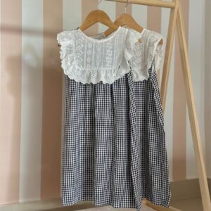 ₹999.00This gingham dress is crafted from breathhable cotton with a classic black and white check pattern. The highlight is its beautifully crafted white lace and frilled sleeves, adding grace to it.