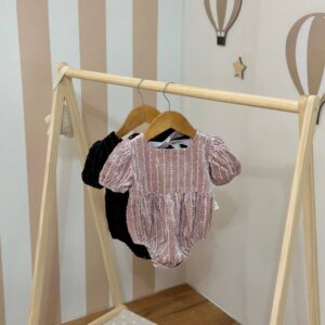 ₹1,799.00The Celine Romper is crafted from soft velvet and adorned with delicate vertical thread work that adds subtle texture and elegance. Designed with puff sleeves and a flattering square neckline, it ties at back for a polished finish. Available in a charming dusty rose and classic black ideal for festive gatherings and special moments.