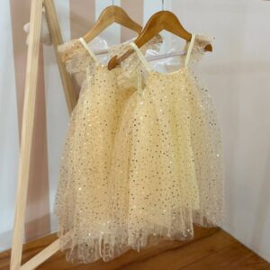 ₹1,699.00A dreamy ivory and gold shift dress for your little star. Crafted from soft gauze tulle, this dress features shimmering golden sequins that swirl across the bodice and skirt, creating a magical glow. The back tie ensures a snug fit on the shoulders, while the breathable cotton lining keeps it gentle on the skin. Perfect for birthdays, parties, or any day that deserves a little sparkle.
